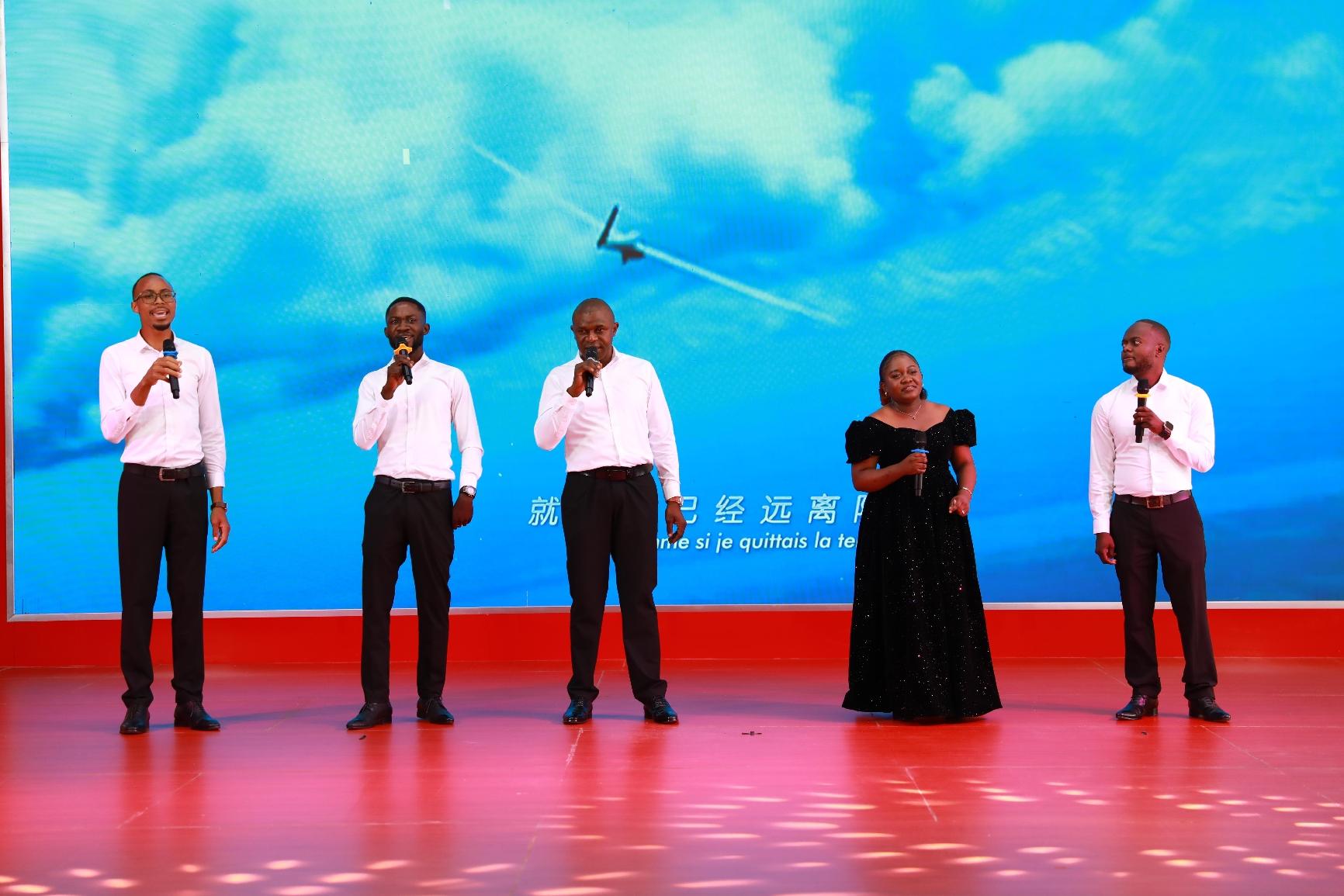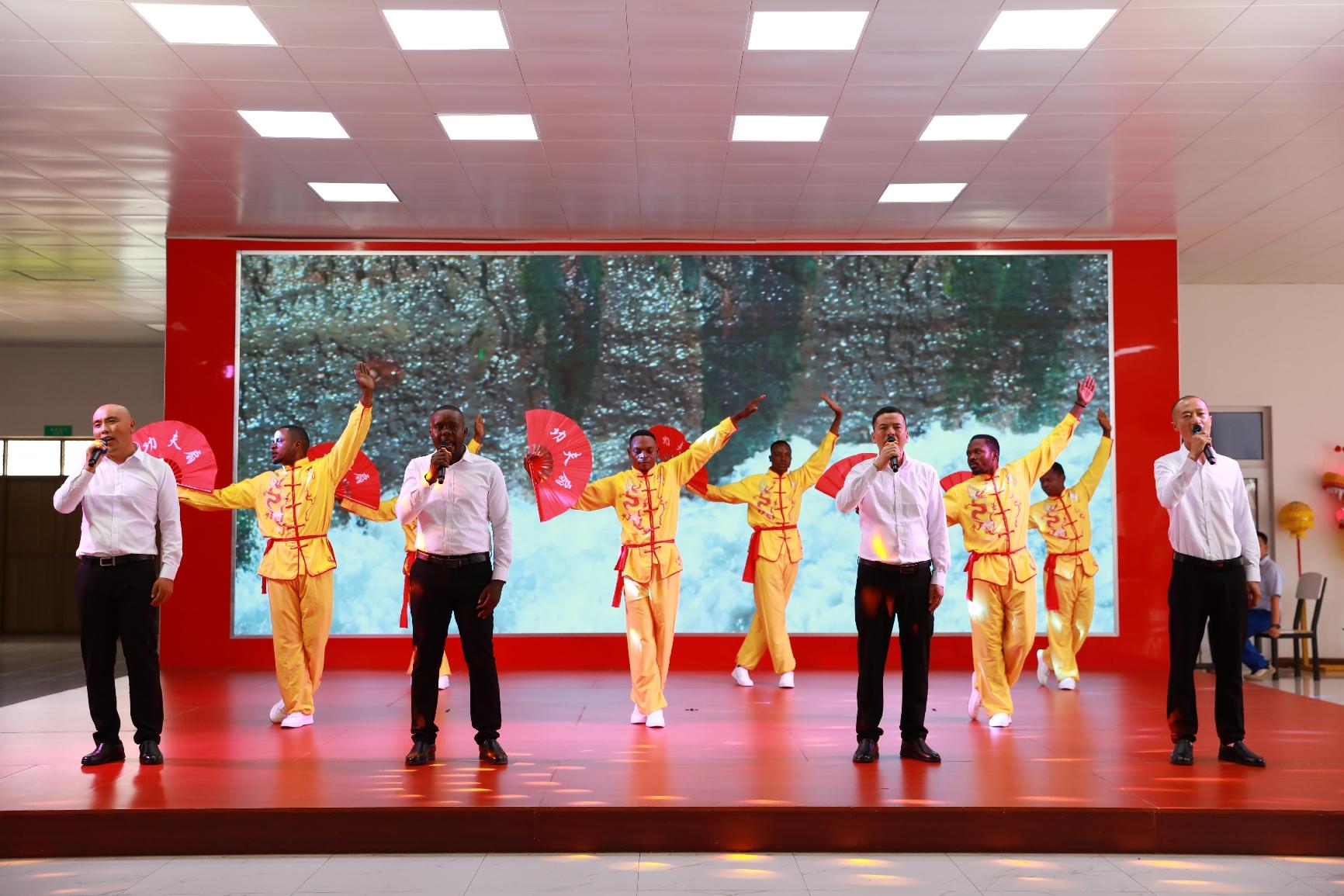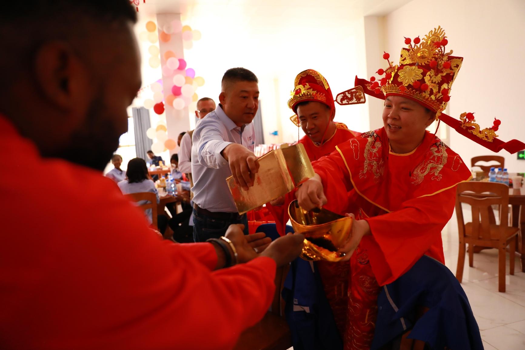 随着激昂的锣鼓点,公司舞龙队精神抖擞地展示舞龙这一中华传统文化。龙腾盛世,辞旧迎新,拉开联欢会的序幕。首先上场的是歌舞《开门红》,在中方员工的歌声里,刚方员工跳起了中国民族民间舞,生动诠释了《开门红》中蕴含的喜悦与期盼。黄色对襟褂,功夫扇,这首慷慨激昂的《精忠报国》,在中刚方员工的共同演绎下,气势如虹,十分地道。身着蒙古服,刚方员工用灵动的身姿表演《特斯河之赞》,豪迈的草原风情扑面而来。当刚方员工用中文演唱《欢颜》《别知己》《纤夫的爱》,天籁般的嗓音空灵、婉转、悠扬,让观众如醉如痴。中方员工表演的汉服秀《一眼望千年》,方寸舞台浓缩了华夏衣冠,让观众感受汉服之美。溯源中华,千年文脉,更加坚定了中方员工的文化自信。相声《矿山小兵的自我提升》,用传统曲艺形式表现公司青年的成长之路,十分接地气。诗朗诵《月光下的中国》,表达了海外员工对祖国的深深眷恋。“财神”送福,祝大家福气满当当。当地员工演唱的法语歌曲《我的太阳》《在风中》,充分展示了他们的音乐天赋与才华,赢得满堂彩。还有中方员工演唱的《凡人歌》《真心英雄》《鸿雁》,员工家属表演的舞蹈,精彩纷呈。当所有人挥舞着中、刚两国国旗,合唱《我和我的祖国》,现场气氛达到了顶点。文化的交流与融合,让中刚友谊更加深厚。