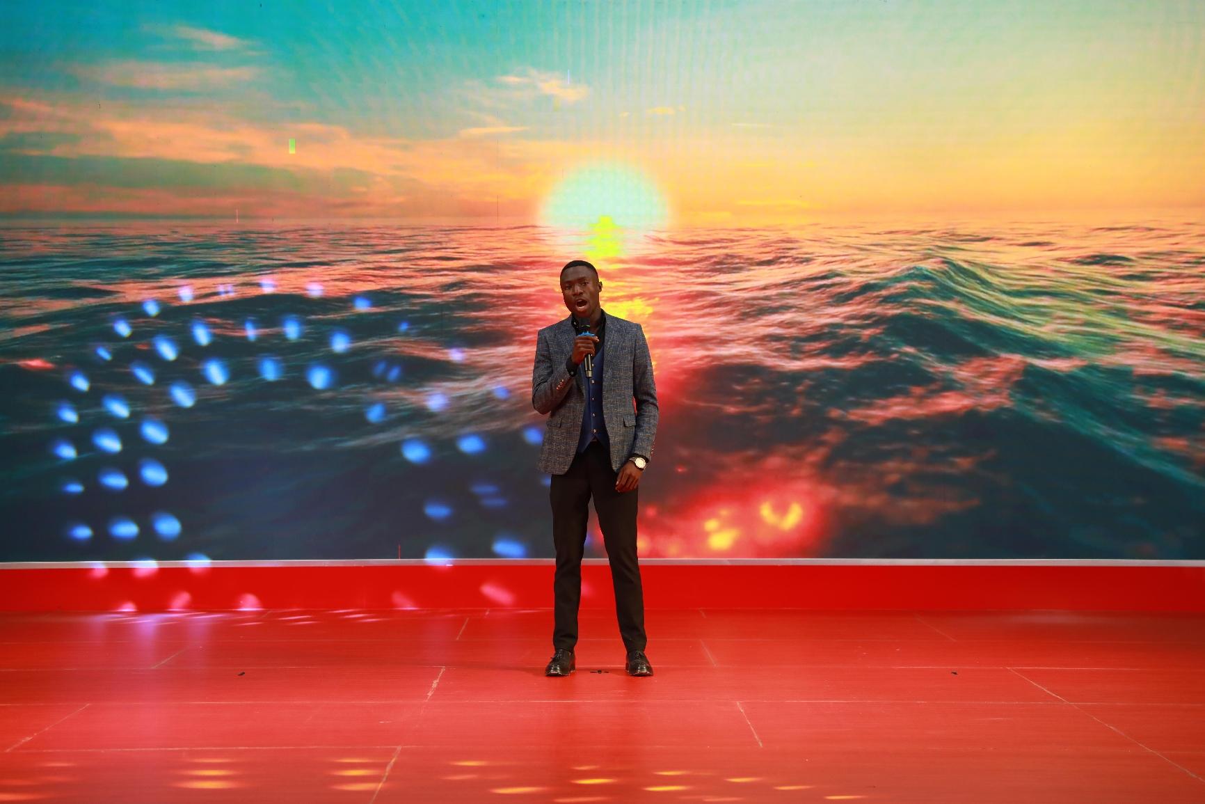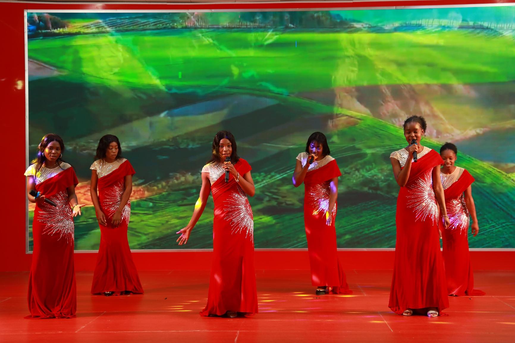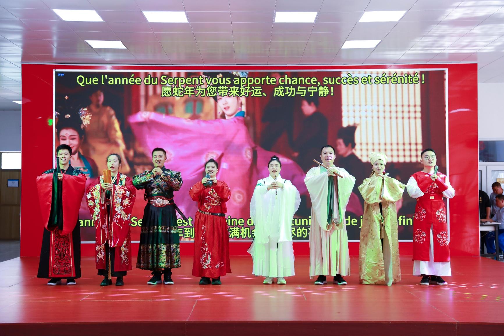 随着激昂的锣鼓点,公司舞龙队精神抖擞地展示舞龙这一中华传统文化。龙腾盛世,辞旧迎新,拉开联欢会的序幕。首先上场的是歌舞《开门红》,在中方员工的歌声里,刚方员工跳起了中国民族民间舞,生动诠释了《开门红》中蕴含的喜悦与期盼。黄色对襟褂,功夫扇,这首慷慨激昂的《精忠报国》,在中刚方员工的共同演绎下,气势如虹,十分地道。身着蒙古服,刚方员工用灵动的身姿表演《特斯河之赞》,豪迈的草原风情扑面而来。当刚方员工用中文演唱《欢颜》《别知己》《纤夫的爱》,天籁般的嗓音空灵、婉转、悠扬,让观众如醉如痴。中方员工表演的汉服秀《一眼望千年》,方寸舞台浓缩了华夏衣冠,让观众感受汉服之美。溯源中华,千年文脉,更加坚定了中方员工的文化自信。相声《矿山小兵的自我提升》,用传统曲艺形式表现公司青年的成长之路,十分接地气。诗朗诵《月光下的中国》,表达了海外员工对祖国的深深眷恋。“财神”送福,祝大家福气满当当。当地员工演唱的法语歌曲《我的太阳》《在风中》,充分展示了他们的音乐天赋与才华,赢得满堂彩。还有中方员工演唱的《凡人歌》《真心英雄》《鸿雁》,员工家属表演的舞蹈,精彩纷呈。当所有人挥舞着中、刚两国国旗,合唱《我和我的祖国》,现场气氛达到了顶点。文化的交流与融合,让中刚友谊更加深厚。