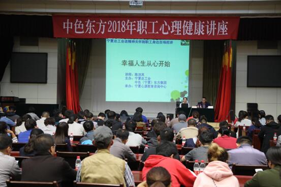 2018年4月25日,中国有色集团出资企业中色(宁夏)东方集团有限公司(简称:中色东方)工会举办了以《幸福人生从心开始》为主题的职工心理健康知识讲座。来自中色东方所属各单位的200多名职工聆听了讲座。