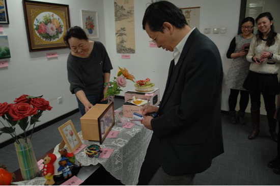 王宏前总经理观赏女职工手工艺品展
