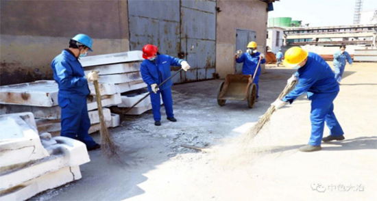 中色大冶冶炼厂团员青年对相关区域的卫生和含铜物料进行清理、回收