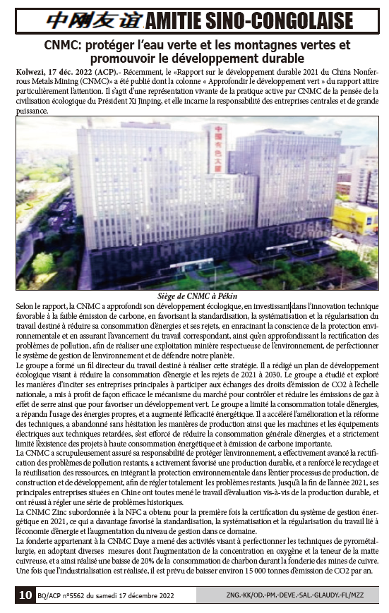 刚通社是中南部非洲最具权威主流媒体之一,创办有《中刚友谊》专栏。这是在继2021年5月五连载发布《中国有色集团刚果(金)可持续发展报告》之后,再一次全媒体集中宣传推介中国有色集团,形成了良好的国际舆论环境。
