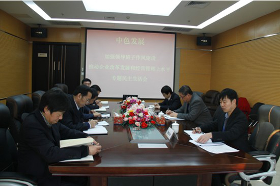 2013年1月16日,中色发展按照集团公司党委统一安排,以“加强领导班子作风建设,推动企业改革发展和经营管理上水平”为主题,召开了2012年度党员领导干部民主生活会。中国有色集团总经理罗涛出席民主生活会,并作了重要讲话,集团公司人事部、党群工作部有关人员参加了会议。