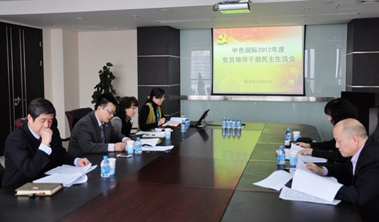 根据集团公司统一部署和要求,中色国际于2012年12月27日下午召开了主题为“加强领导班子作风建设,推动企业改革发展和经营管理上水平”的党员领导干部民主生活会。会议由中色国际党支部书记、总经理唐伟力同志主持,中色国际领导班子全体成员参加了会议。集团公司直属机关党委、审计部(纪检监察室)有关同志参加了会议。