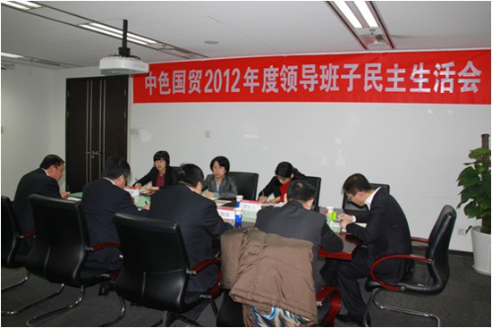 2012年12月12日上午,中色国贸领导班子以“加强领导班子作风建设,推动企业改革发展和经营管理上水平” 为主题召开2012年度民主生活会,中色国贸领导班子成员参加了会议。会议由中色国贸党委副书记高顺清同志主持,中国有色集团副总经理、中色国贸董事长、党委书记、总经理李筱英同志出席会议并作点评,集团公司相关部门负责人参加会议。