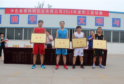 2014年8月28日—30日,中国有色集团出资企业中色奥博特铜铝业有限公司(简称中色奥博特)举办了2014年度职工篮球赛, 4支代表队48名队员参加比赛。中色奥博特董事长、党委书记刘占海,党委副书记时玉华,副总经理张金碧、姜业欣等公司领导出席开幕式并观看了比赛。