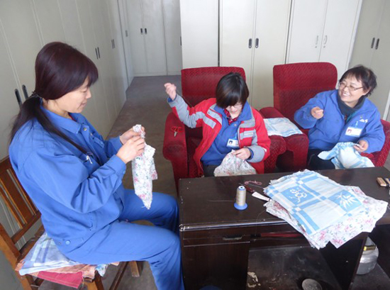 八分布,十分情。节前公司女职工以“我为公司做点事”为主题,开展缝制爱心 “八分布”活动。“八分布”是车间中用于擦机床设备的一种抹布,由两块一尺见方的棉布缝制而成。为了节约成本,公司女职工把家中不用的衣服裤子裁减了,亲手缝制成爱心“八分布”捐给公司,体现的是公司女职工情系沈冶的浓浓情意。在捐献仪式上,34个分(支)会的446人一针一线缝制的5710块爱心“八分布”是女职工们爱企业的一片心意。其中134块、110块是分别出自质量监管部柳新和重装基地建设指挥部于敏之手。