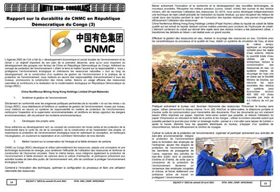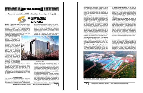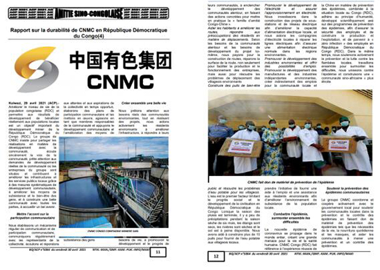 2021年4月17日至5月7日,刚果国家通讯社在其纸质日报《中刚友谊》专栏上发布中国有色集团刚果(金)可持续发展报告,并在其官方网站、推特及脸书平台上进行同步转发,覆盖粉丝近百万,矩阵传播效果明显。