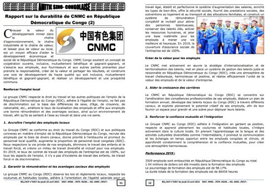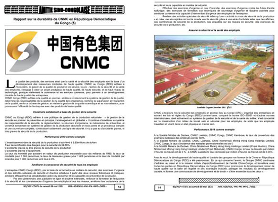 此次可持续发展报告发布活动以连载的形式进行,共有五期,涉及版面10个,分别从和谐劳资关系、维护和谐生态、关怀社会福祉、安全生产等方面对中国有色集团进行全面报道,体现了集团公司坚守深化中刚友谊的初心和使命,与刚果(金)各方一起,在平等互利的基础上,共促高质量的矿业发展,形成“你中有我、我中有你”的发展共同体和命运共同体。