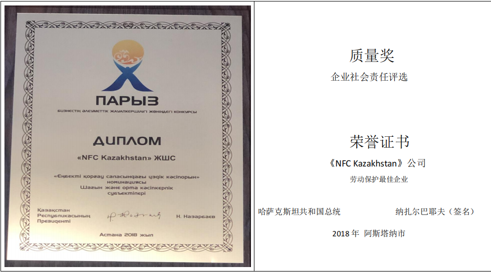 2018年中色哈萨克斯坦公司荣获企业社会责任...